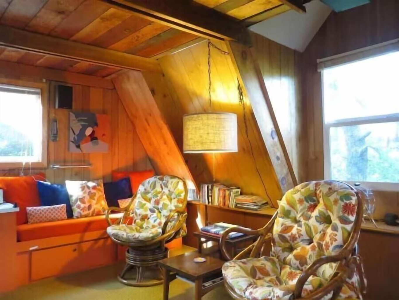 1 Bedroom • 1 Bathroom 1 Bath • Sleeps 1-4Anchors A-Way is a charming 1965 A-frame tucked into a quiet coastal nook π², a petite time capsule of mid-century modest. Just 600 square feet, this darling gem has been a beloved family retreat since 1976, now lovingly passed to the next generation. It’s a place where stories linger in the woodgrain and laughter echoes from summers past.