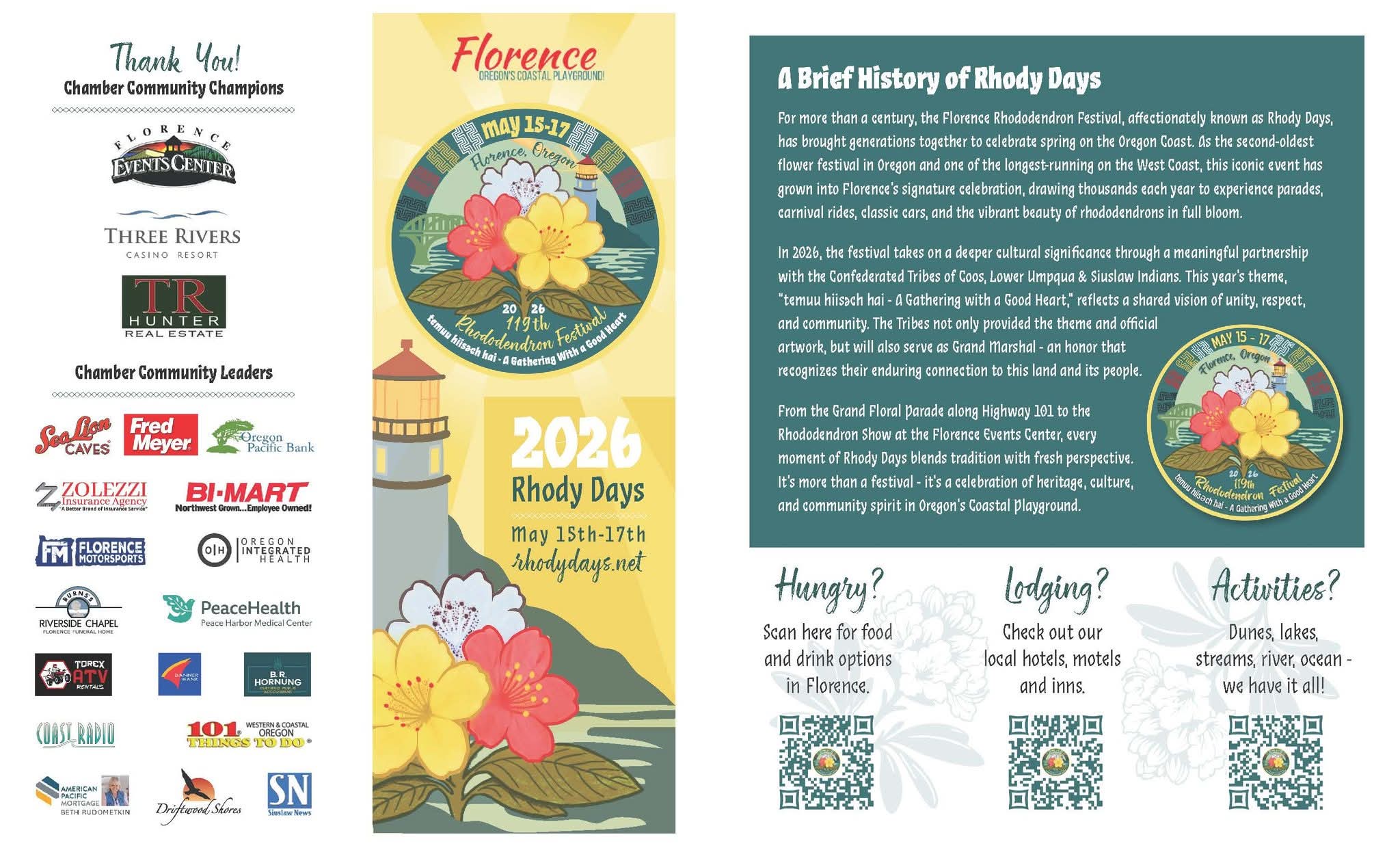 Whales Watch Vacation Rentals Rhody Days Schedule 5/14/2026 -5/17/26 Posted on April 18, 2026 Latest Posts Rhody Days Schedule 5/14/2026... 119th Rhododendron Festival Heceta Head Lightstation Birth... 🏜️ Save the Oregon Dunes Annu... 🎨 2nd Saturday at FRAA - Marc... Subscribe By RSS Facebook Instagram Youtube