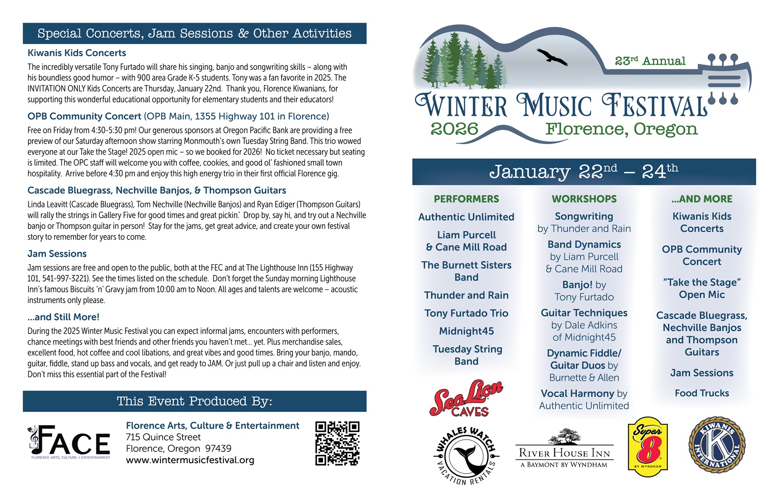 Whales Watch Vacation Rentals Winter Music Festival Schedule Posted on January 14, 2026 Latest Posts Oregon's coastal playground: d... Wine, Ch9owder & Glass Float T... National Plan for Vacation Day... Winter Music Festival Schedule The Winter 2025 Whale Watch Ev... Subscribe By RSS Facebook Instagram Youtube