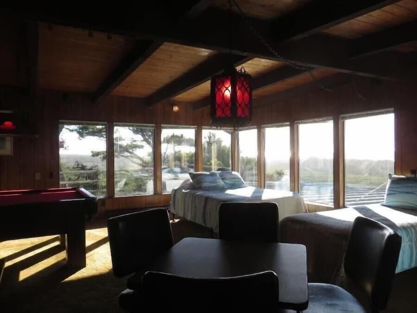 Upstairs, the second floor opens into a playful game room with more sweeping views, a pool table ๐ฑ, wet bar, and another bathroom. Sleeping arrangements include a full-size bed and two twins, ideal for couples or families with kids ready to explore the dunes. The stairway glows with filtered light through groovy textured glass, leading to the upper deck where you can sip something cold and watch whales breach and eagles soar ๐๐ฆ .