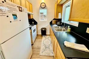 The kitchen is stocked with a full-sized oven and refrigerator, toaster, Keurig dual brew (pod & pot) coffee maker, microwave, blender, and all the kitchen basics. (sorry no dishwasher)