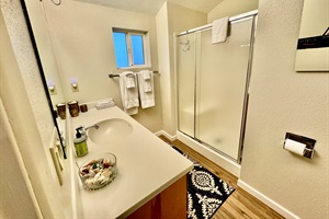On the other side of the living room you'll find the second bedroom has a queen bed, 45 inch TV with Fire stick, and an adjacent bathroom just down the hall. This makes both bedrooms private and makes it a perfect house for two couples.