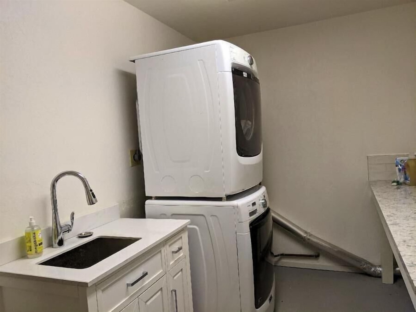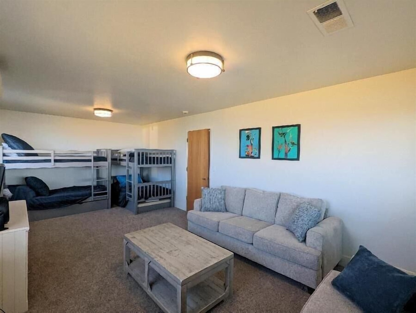 ๐ On the first level, you'll find a 2-car garage, plus a bunk room with two sturdy bunk beds — perfect for kids or golf buddies. A cozy sofa and TV make it a great spot to catch the big game or hook up a game console ๐ฎ. There's also a large laundry room with a front-loading washer & dryer, folding counter, and wash tub, along with a full bathroom with shower ๐ฟ.