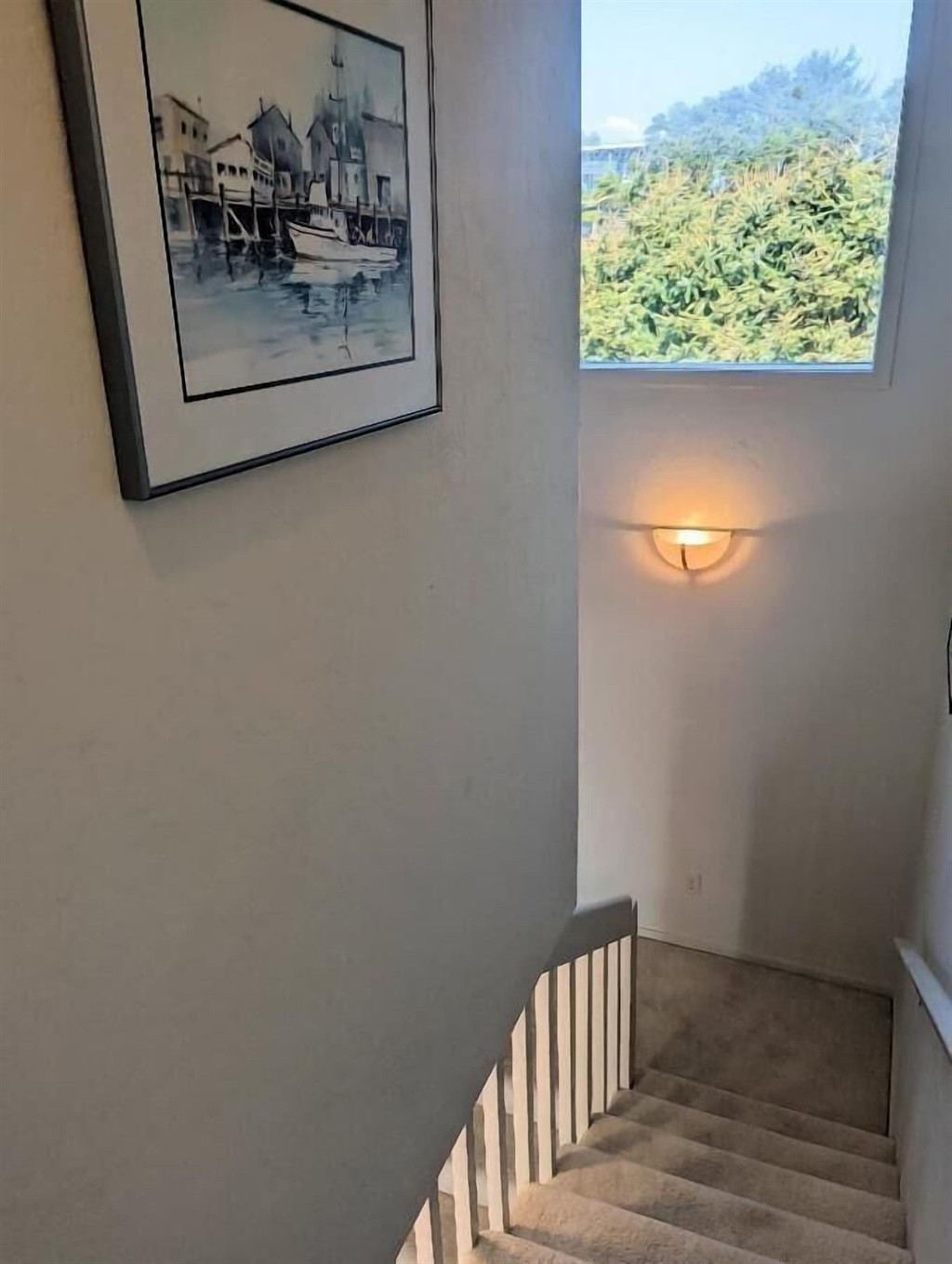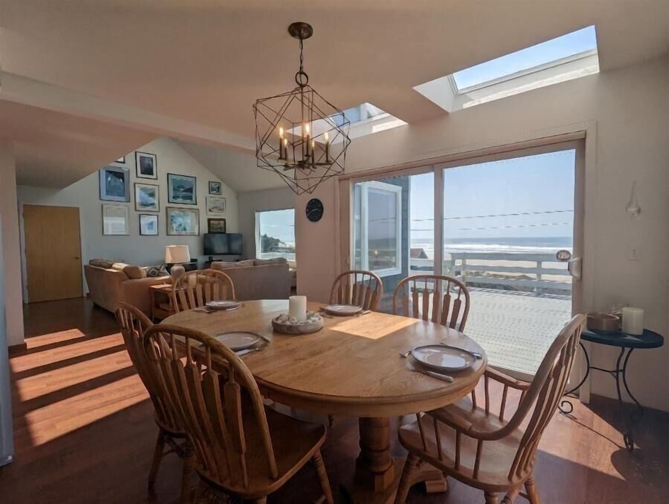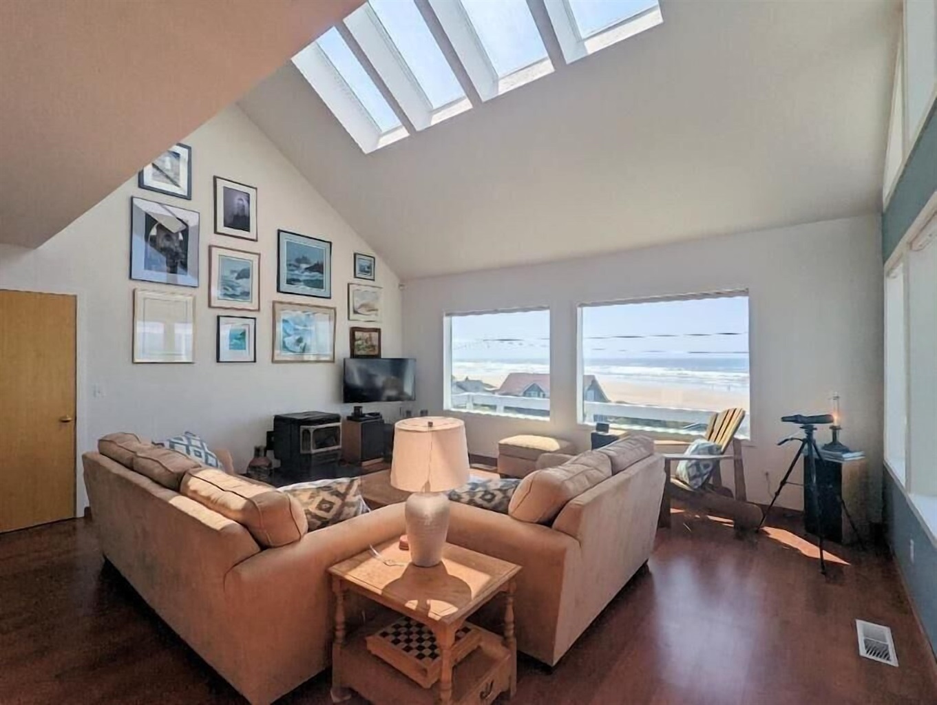 ๐๏ธ Head upstairs to the second floor, where the great room awaits. This level features a foodie’s dream kitchen ๐ณ, a dining area for 8, a pellet stove ๐ฅ, a large smart TV, and a plush sectional sofa — all with spectacular views of Heceta Beach. Step out onto the deck with its glass wind wall for breezy, protected outdoor lounging ๐ฌ๏ธ. Also on this level: a full bath and a queen bedroom.