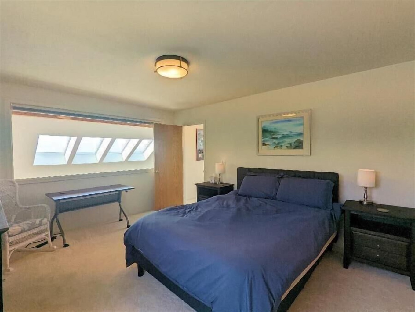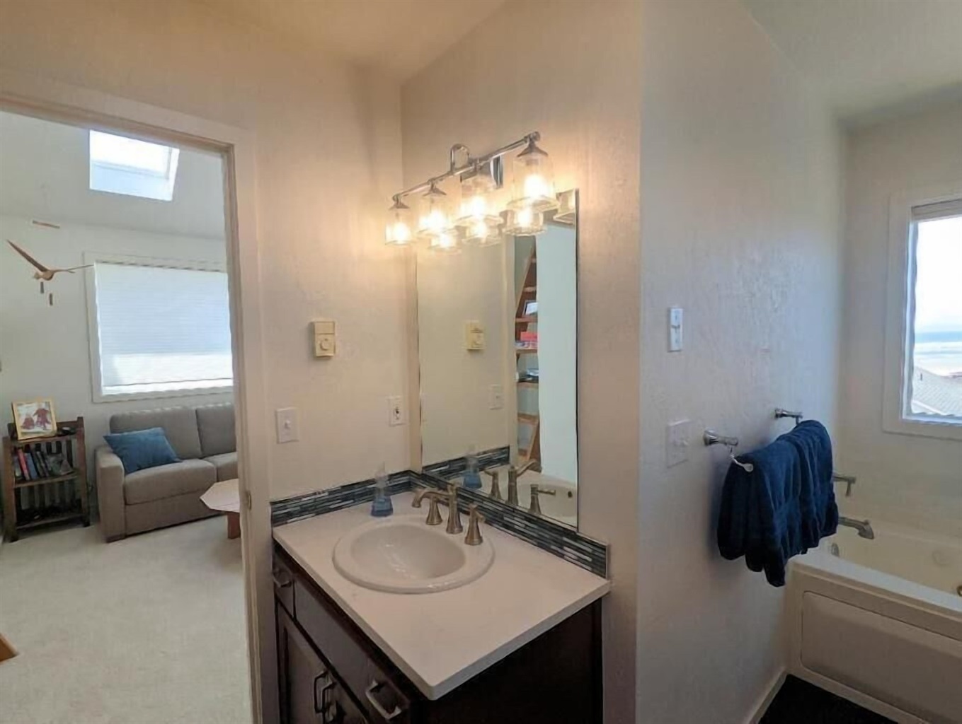๐๏ธ The third floor is home to the master suite, complete with a queen bed and a desk for remote work or Zoom meetings ๐ป. A separate family TV room with Roku and a comfy sofa offers another place to unwind, and the bathroom features dual vanities and a relaxing jacuzzi tub ๐. From the sitting area, you’ll enjoy sweeping views of the beach and the iconic Heceta Head lighthouse ๐ .